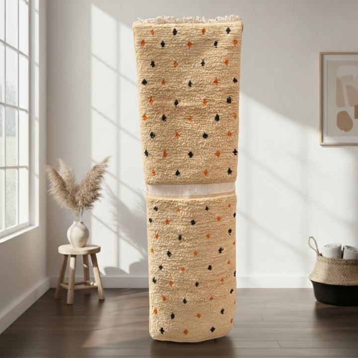 Hand-dyed with natural pigments, each rug showcases authentic Moroccan craftsmanship and a harmonious blend of colors and patterns. Their soft texture and warm tones add cozy elegance and a touch of Moroccan charm wherever you place them.