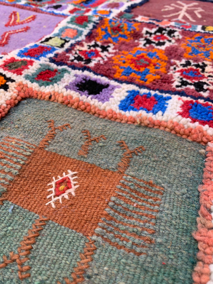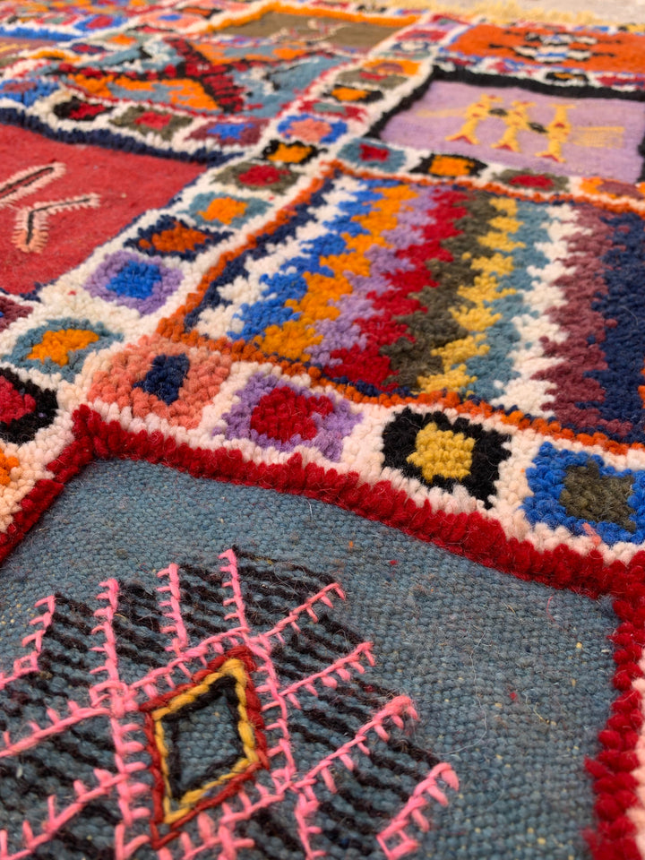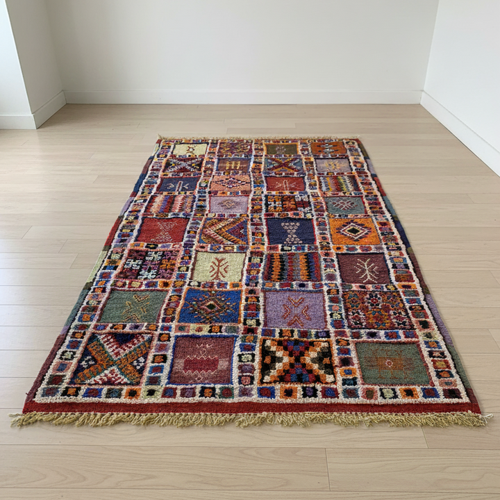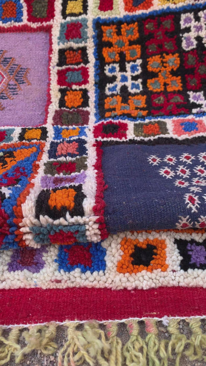 Bring home a one-of-a-kind Moroccan treasure 🎨. Handwoven in Taznakht, Morocco, this rug is crafted from 100% natural wool and features vibrant multicolor motifs with antique-inspired patterns. The unique mix of knotted and flat-woven squares adds texture, charm, and timeless beauty — perfect for making a statement in any room.