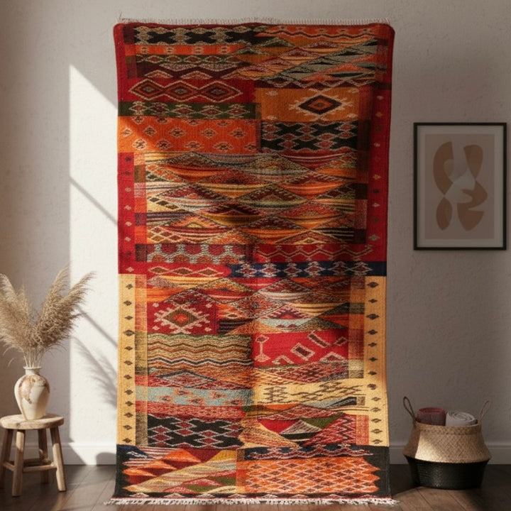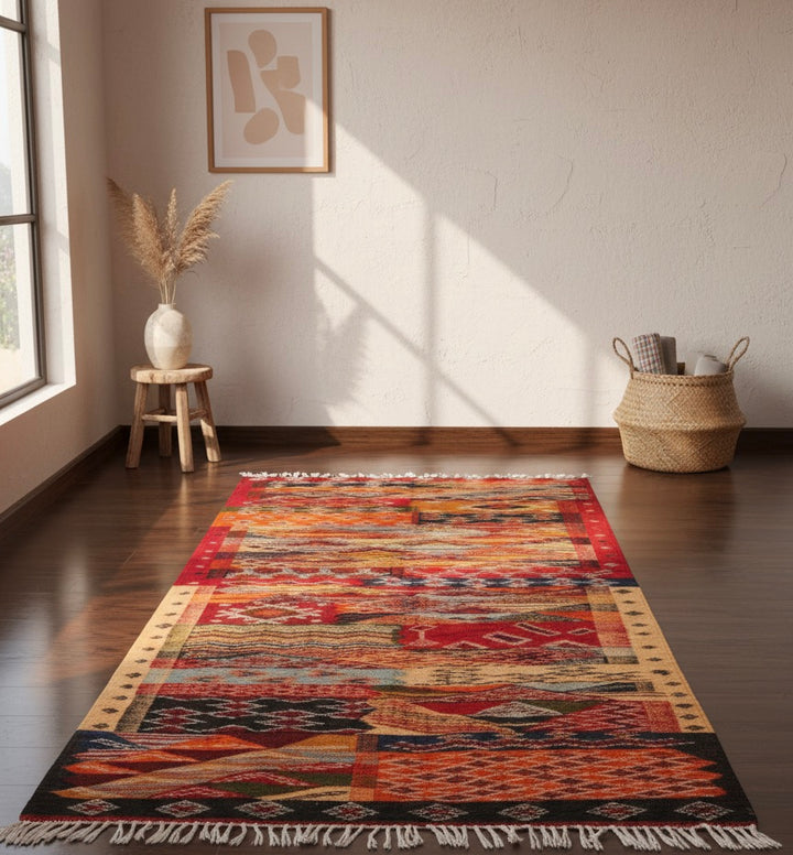 Every motif tells a story, and the rich red tones highlight the elegance of its design, making it a unique statement piece for your living room, bedroom, or cozy reading nook.