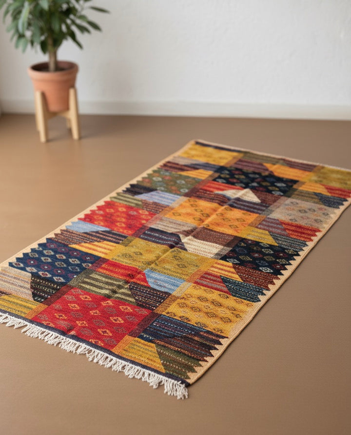 This reversible rug features the same design on both sides, offering versatility and long-lasting durability. Its practical size makes it a perfect fit for a bedroom, small living room, or cozy reading nook, adding warmth, texture, and cultural charm to any space.