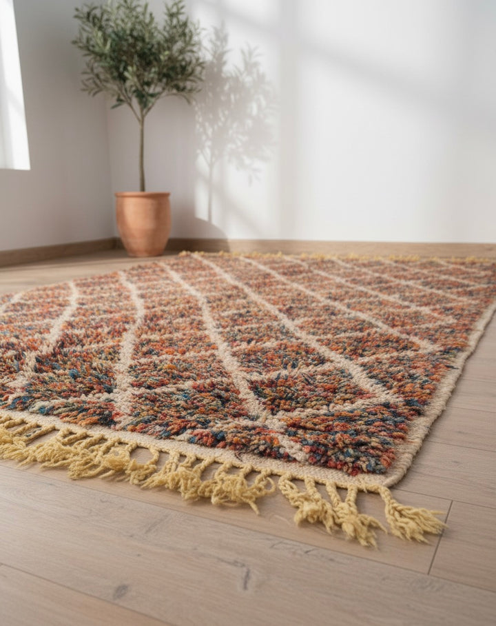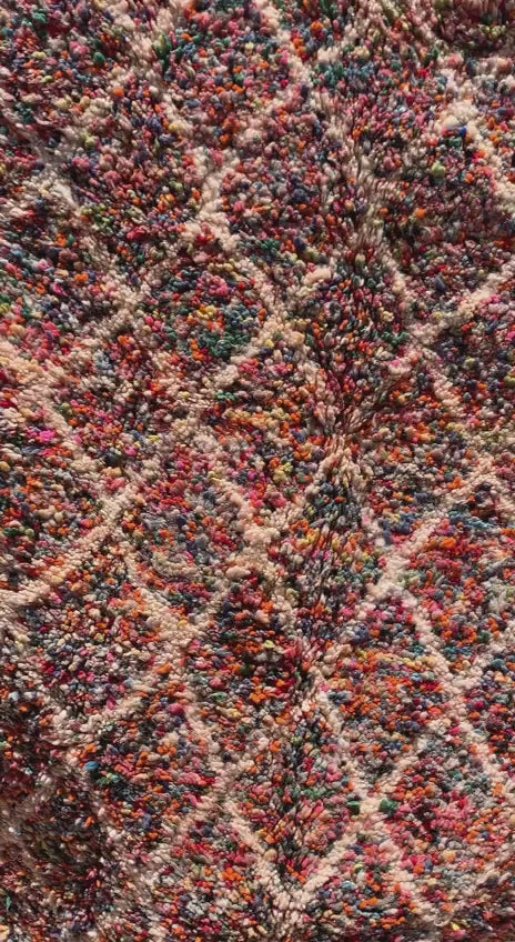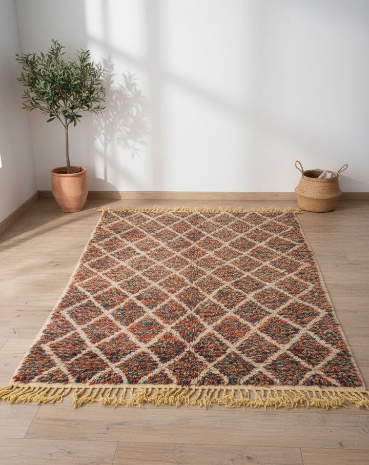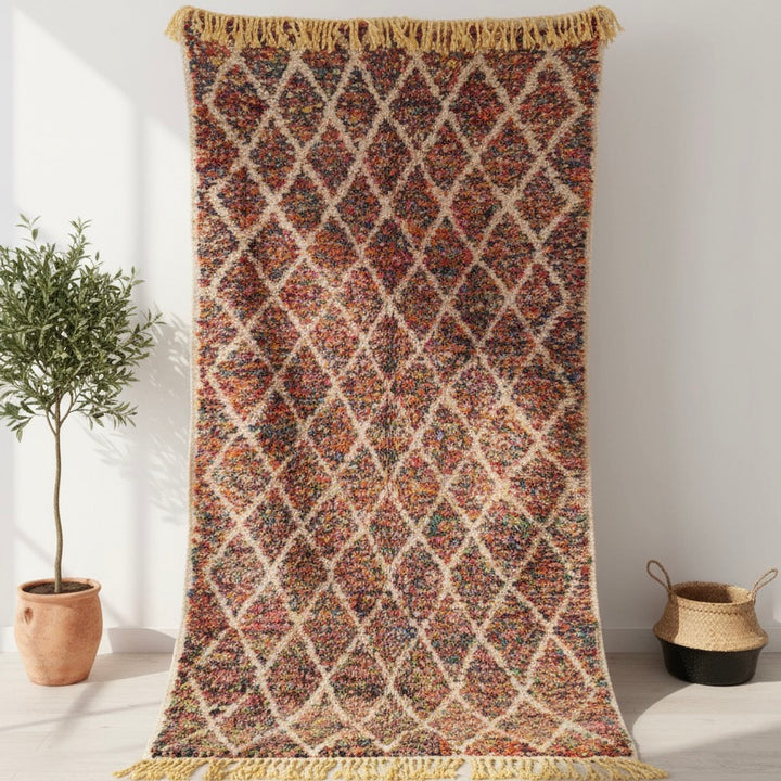 Bring life, color, and warmth to your home with this stunning multicolored Kharita rug, handwoven by skilled artisans in Taznakht, Morocco. Made from 100% natural wool, each motif and color is thoughtfully chosen to create a harmonious balance between traditional Amazigh heritage and modern style.