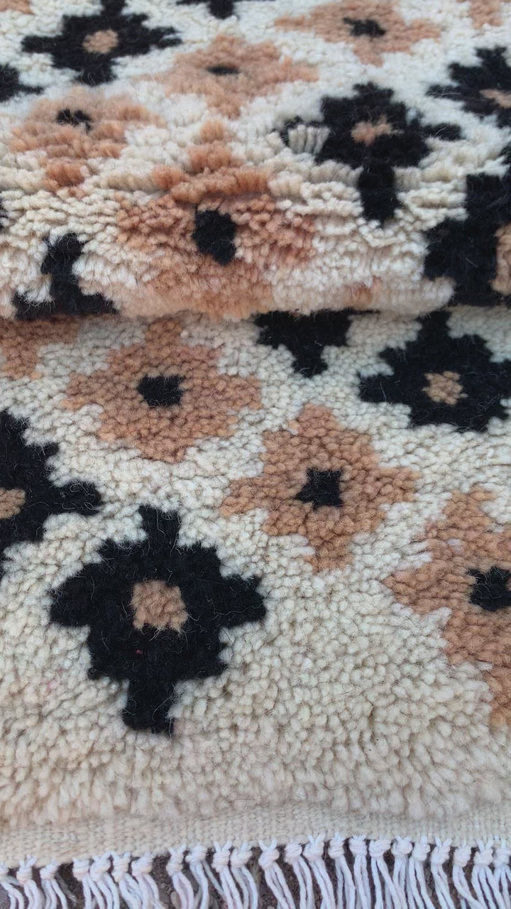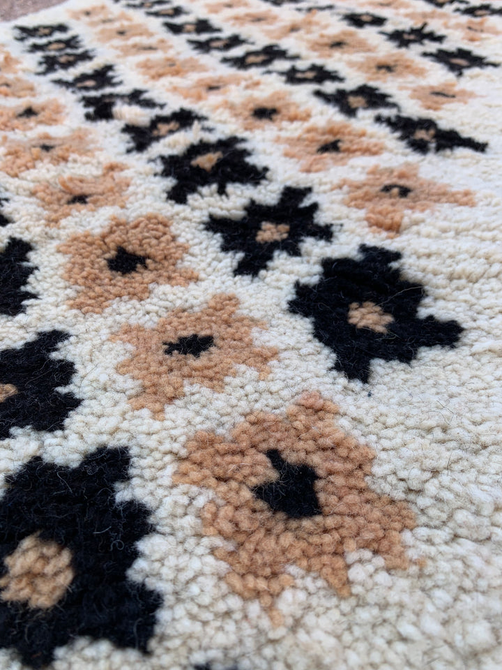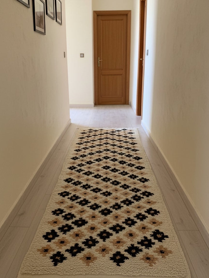 Bring timeless elegance to your home with this White Knotted Runner, beautifully handwoven in Taznakht, Morocco. Crafted from 100% natural wool, it features bold black floral motifs on a soft white base — a perfect balance of simplicity and contrast.
